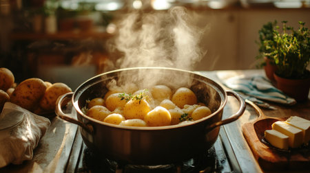 A kitchen scene with boiled potatoes in a pot, steam rising as they await mashing, butter and herbs nearby, creating a warm, cozy environment