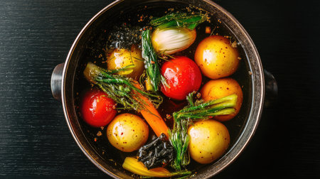 A black pot filled with vibrant fresh ingredients like tomatoes, onions, and greens, ideal for creating a wholesome vegetable broth. Perfect for cooking enthusiasts.