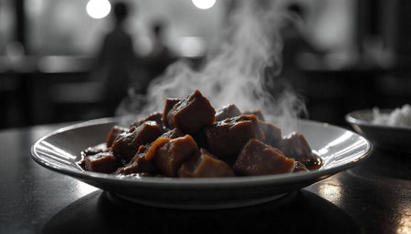Steaming braised pork belly on plate with blurred background