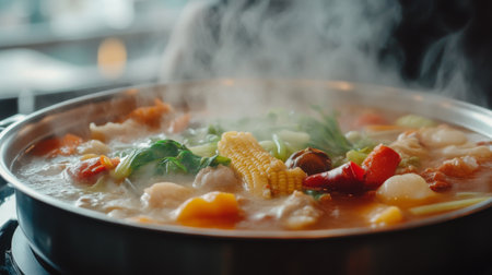 Close-up of a steaming hot pot with various fresh ingredients, including vegetables and meat, showcasing the bubbling broth and inviting aroma.