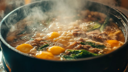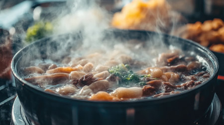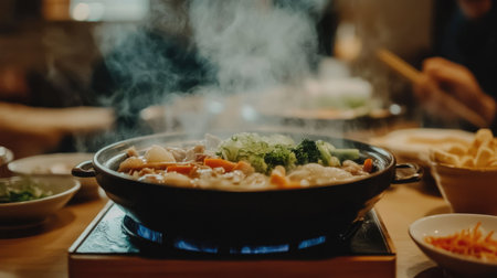 Explore the rich flavors of traditional Japanese hotpot, featuring a delicious steaming broth filled with a variety of fresh ingredients, perfect for sharing meals.