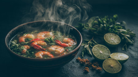 This striking image showcases a warm bowl of shrimp soup with aromatic herbs and zesty lime, enveloped in steam. Perfect for food enthusiasts and culinary projects.