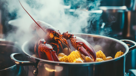 A vibrant lobster is boiling in a pot with corn and potatoes, creating a delightful aroma. This image captures the essence of gourmet cooking and seafood dining.