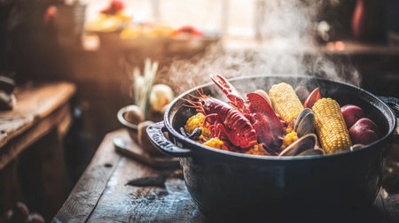 A vibrant seafood boil featuring lobster, corn, and vegetables in a rustic kitchen. The steam rising from the pot adds a cozy, inviting atmosphere perfect for culinary enthusiasts.