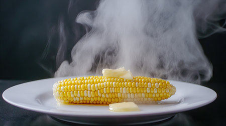 A single golden cob of sweet boiled corn with steam rising, set on a white plate, with butter melting over the kernels for a delicious treat.