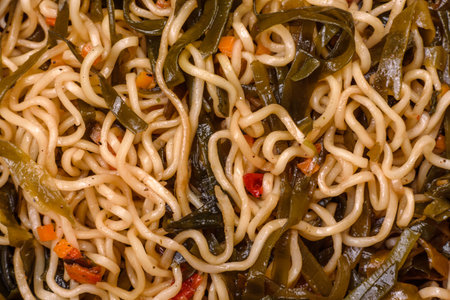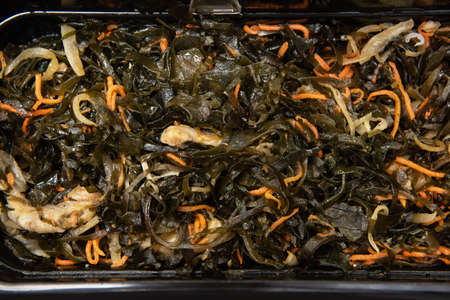 Delicious marinated seaweed with paprika, spices and salt on a dark concrete background. Delicious vegetarian salad