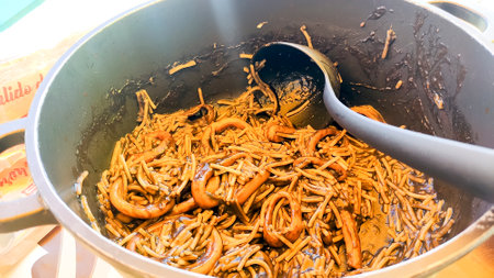 dish noodles black with vegetables and mussels asian food with chopsticks
