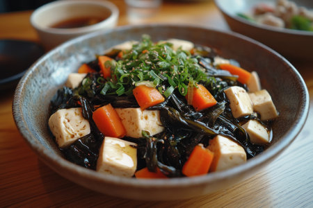 Tender hijiki seaweed combined with tofu and vibrant vegetables garnished with green onions offers a healthy, flavorful experience.