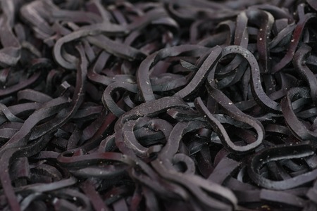 A mozuku seaweed placed on a black background.Mozuku is an Okinawan delicacy. It is a kind of dark, thread-like seaweed seasoned with vinegar