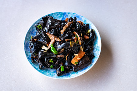 Dried mun mushrooms, Chinese traditional medicine and cuisine. Fungi ingredients in plate on beige background