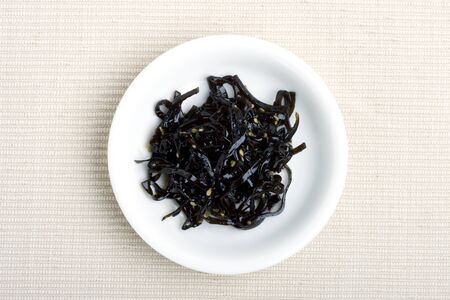 Top view of dried wakame seaweed in a wooden bowl on a fabric background, Healthy Asian food ingredient