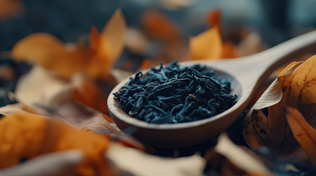 Close-up of dry black tea leaves in a wooden spoon, with scattered leaves nearby, creating a rustic, cozy atmosphere in natural light.