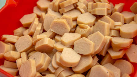 Close up view group of small slices of raw chicken sausage in a red container with isolated white background. Selective focus on foregrounds.