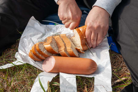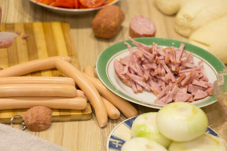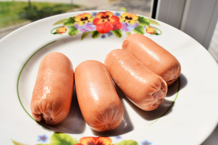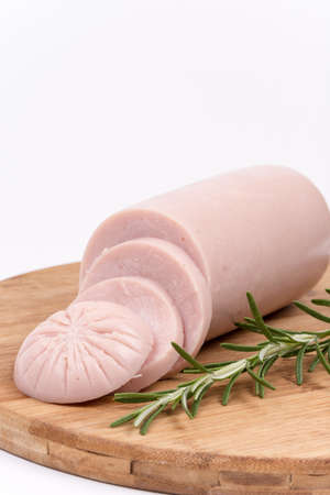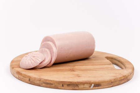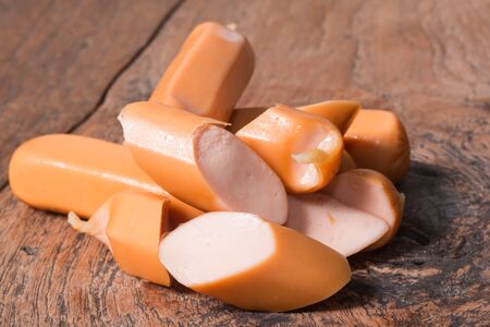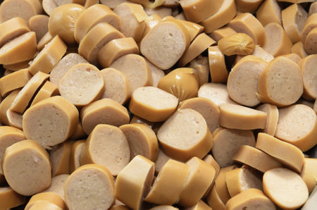 Boiled sausage cut into large chunks. Sausage, a close-up shot.