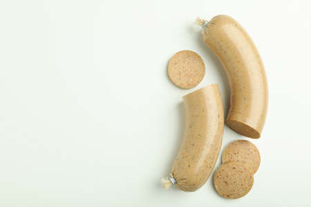Bunch of a several uncooked sausages in natural casing on a light background.