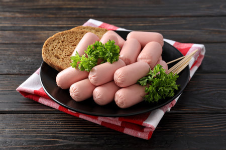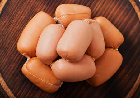 Raw sausages close-up. Sausage products on the background of a wooden box. Gastronomic background with sausages. Food sales.