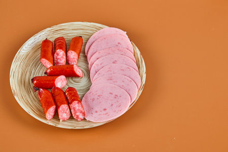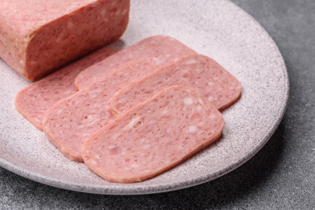 Spiced ham slices, canned meat for lunch sandwiches. Spiced ham as a food backdrop for your design.