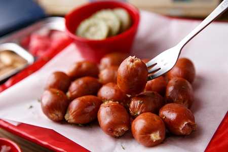 A pan of hunting sausages on a beige table. A portion of ready-to-eat food. Fried sausages. Selective focus.