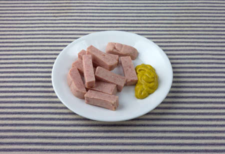 Several slices of pressed pork canned meat on a white plate with mustard on a blue striped tablecloth.