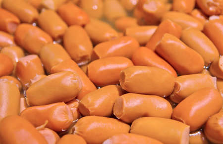 Sausages and sausage close-up. Meat products in the store. The production of sausages. Meat products in the window of a grocery store.