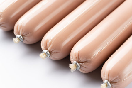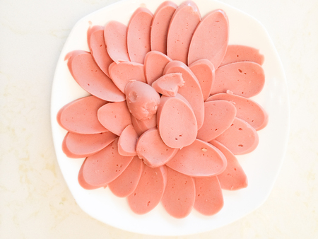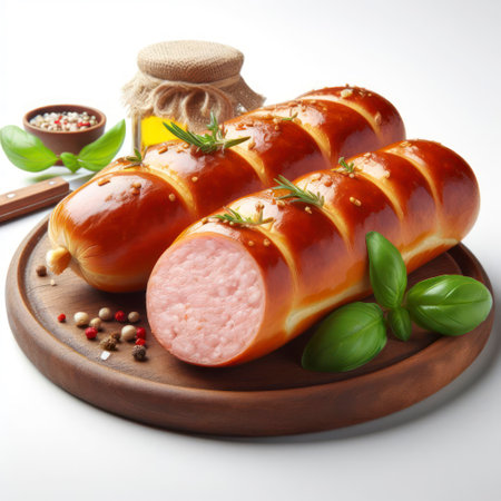 Chicken Sausage,Arranged in layers,On a white plate,White background