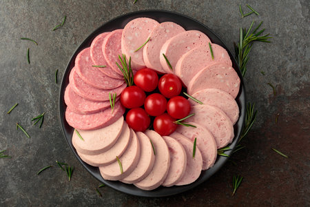 Various boiled sausages with tomatoes and rosemary on a stone table. Top view. Copy space.