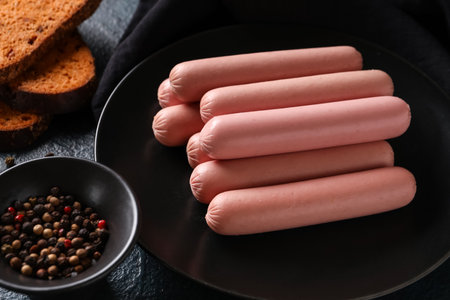 Group of three slices one piece of pork frankfurt sausage isolated on black glass