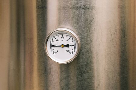 An industrial thermometer is mounted on a stainless steel boiler. Heated cold water. Temperature sensor. Components of heating equipment