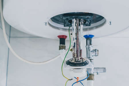 Taking out an electric heater from boiler or water heater to remove lime scale residue on it as part of a maintenance. Electric thermostat being removed from boiler.