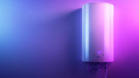 This image showcases a sleek electric water heater mounted on the wall, enhanced by colorful purple and blue lighting, perfect for home improvement and design inspiration.