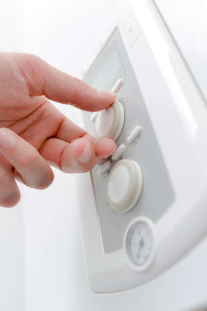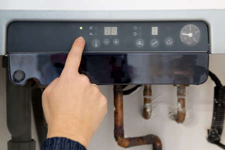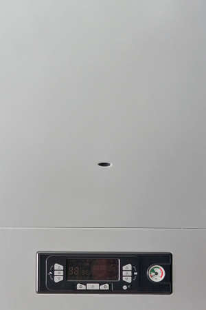 Close-up of control panel of gas boiler with dials and pressure gauge, showing heating settings and temperature indicators in domestic environment