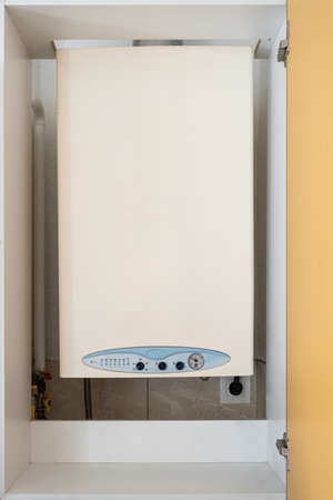 Concept of modern appliance. Side view of new white water heater at the kitchen closet, copy space. Home gas-fired boiler. Installation of household heating equipment in the house
