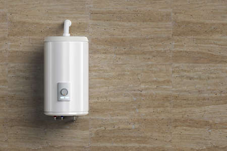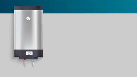 Template with tank for water heating, advertisement on horizontal long backdrop, 3D illustration. Realistic icon of tank for heating of water. The example of registration of the advertising message