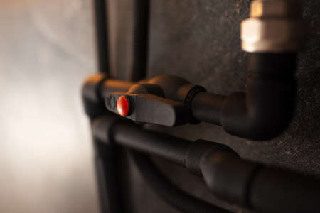 Close up view of warming system element. Pressure indicator and join pipes. Building warming concept.