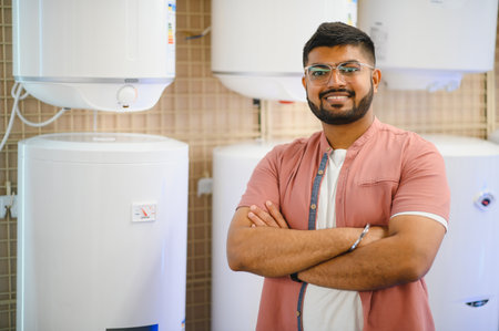 Close up of technician repairing water heater connected to heating boiler with professional lighting