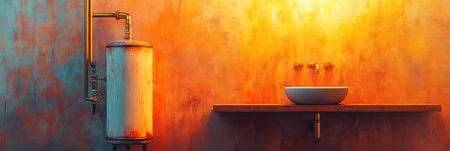 This rustic bathroom corner showcases a vintage water heater with brass pipes complemented by a small basin sink. Warm natural lighting creates an inviting and cozy atmosphere perfect for relaxation.