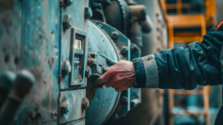 A skilled technician carefully adjusts a pressure valve in an industrial facility. The dim lighting highlights the precision of the work, showing the intricate details of the mechanism.