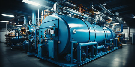Modern industrial gas boiler room equiped for heating process with heating gas boilers, pipe lines, valves. Panoramic view, composed mixed media. Blue toning. : Generative AI