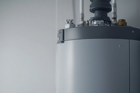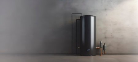 Banner Black Water Heater Tank With Water Temperature Control, Electric Boiler in Modern Boiler Room with Gray Walls and Wooden Floor. Horizontal Plane. Space For Text, AI Generated. Mockup or Design.
