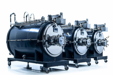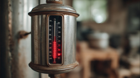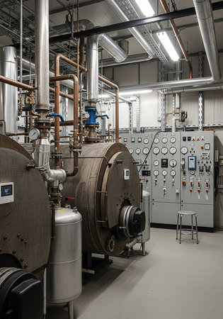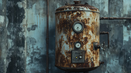 An industrial boiler featuring pressure gauges, set against a backdrop of warm lighting and rustic textures, showcasing engineering elements and machinery.