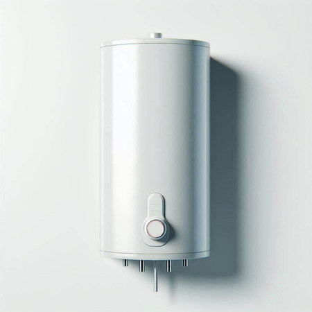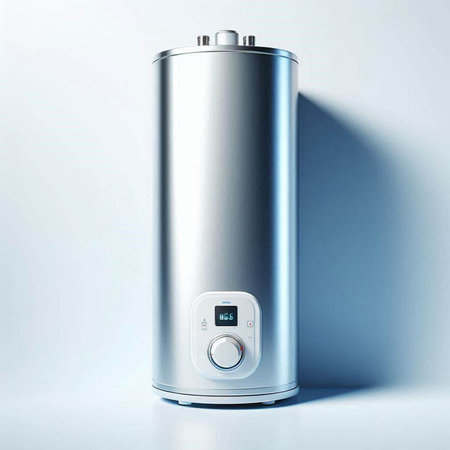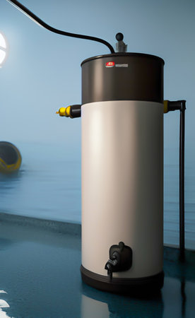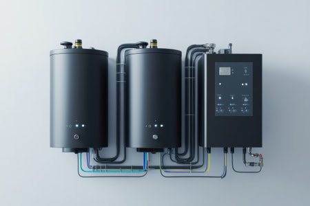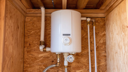A compact, stylish water heating system showcases advanced technology and streamlined pipes in a minimalist interior.