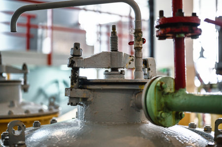 This image captures intricate vintage industrial equipment featuring pressure gauges, emphasizing historical craftsmanship in a factory environment, ideal for engineering themes.