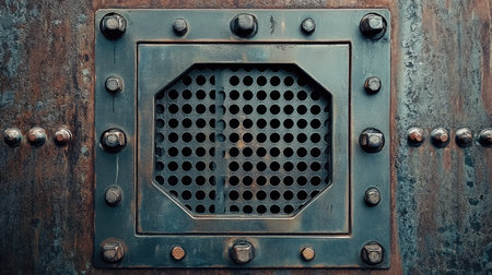 A perforated metallic grid, part of an industrial air vent, surrounded by riveted panels
