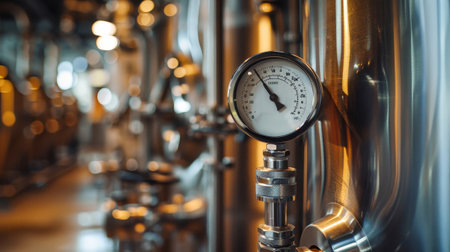 Manometers, pressure gauges and iron pipes on steel tanks at food or beverage factory, close up.