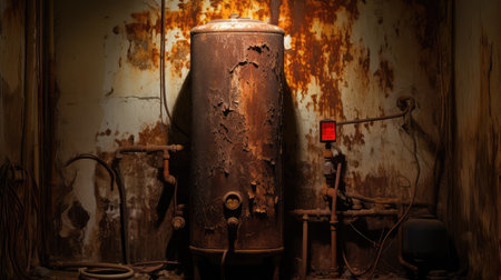 Rusty industrial boiler with pipes and valves in old factory with brick walls and tiled floor, showing industrial heritage
