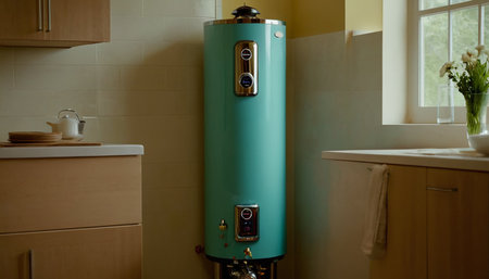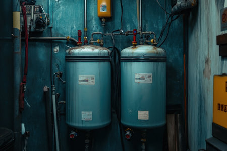 Two large water heaters are positioned against a teal wall, showing industrial plumbing in a vintage setting.
