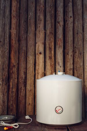 Vertical view of home electric heating boiler for water installed in closed cabinet at the kitchen. White metal case with copy space