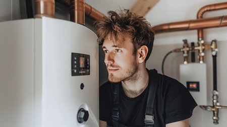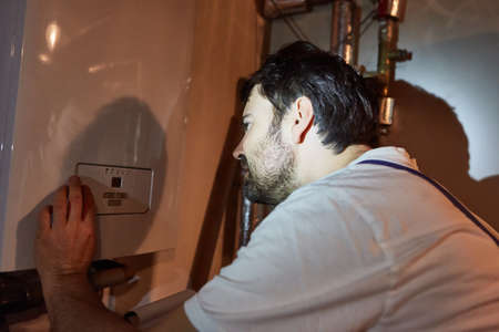 Skilled plumber installing new boiler water heater in residential home, inspecting heating system