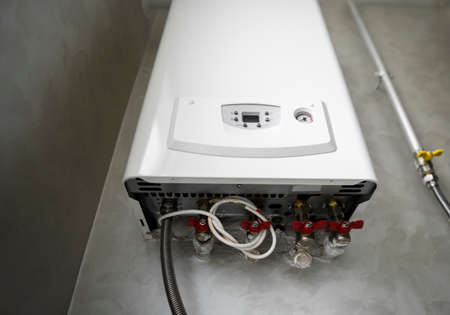 White modern home gas boiler mounted on a grey wall on a kitchen. Water heater. Water heating, ecology.