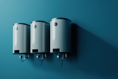 Three sleek water heaters are mounted on a stylish blue wall in a modern home environment.